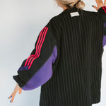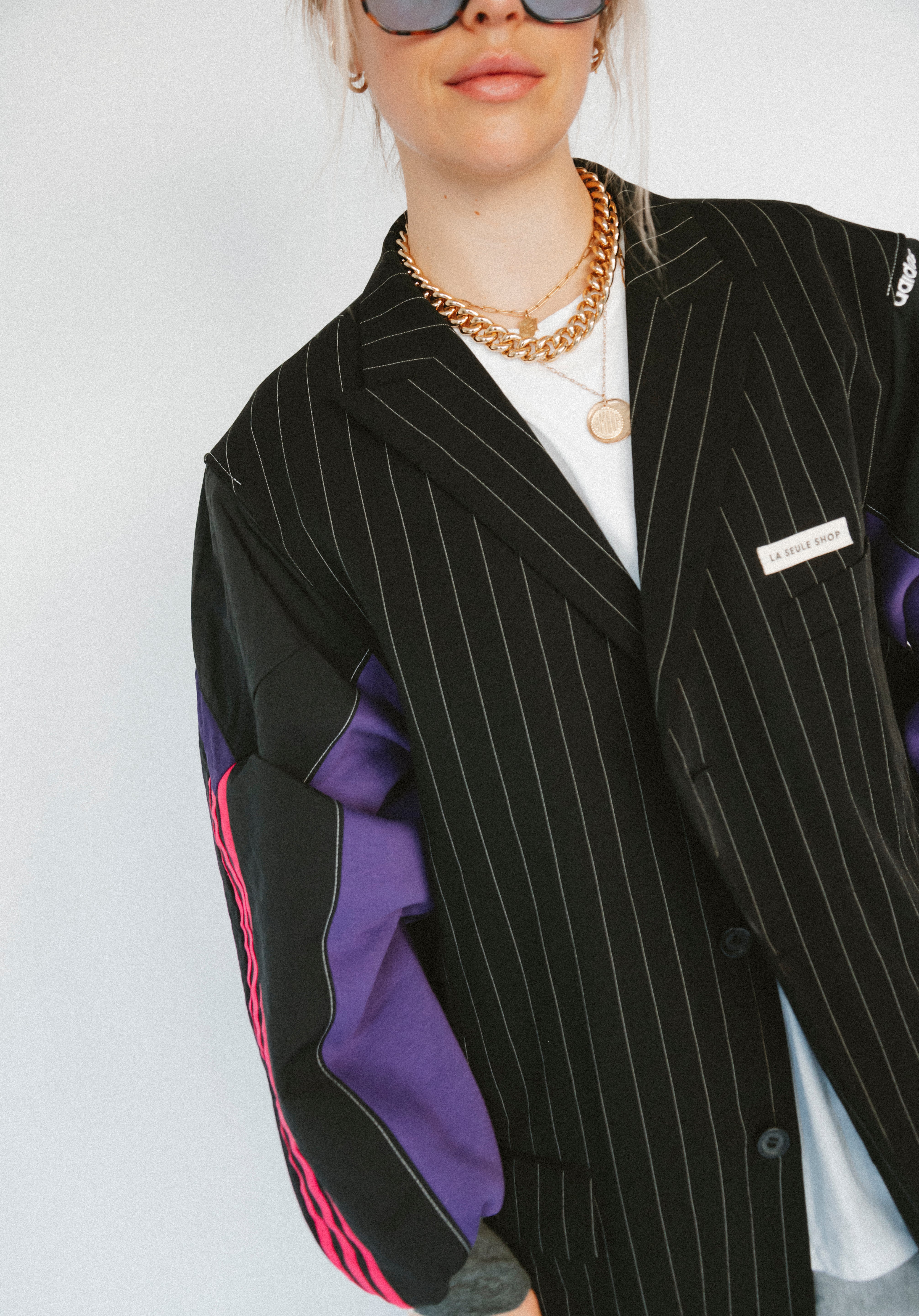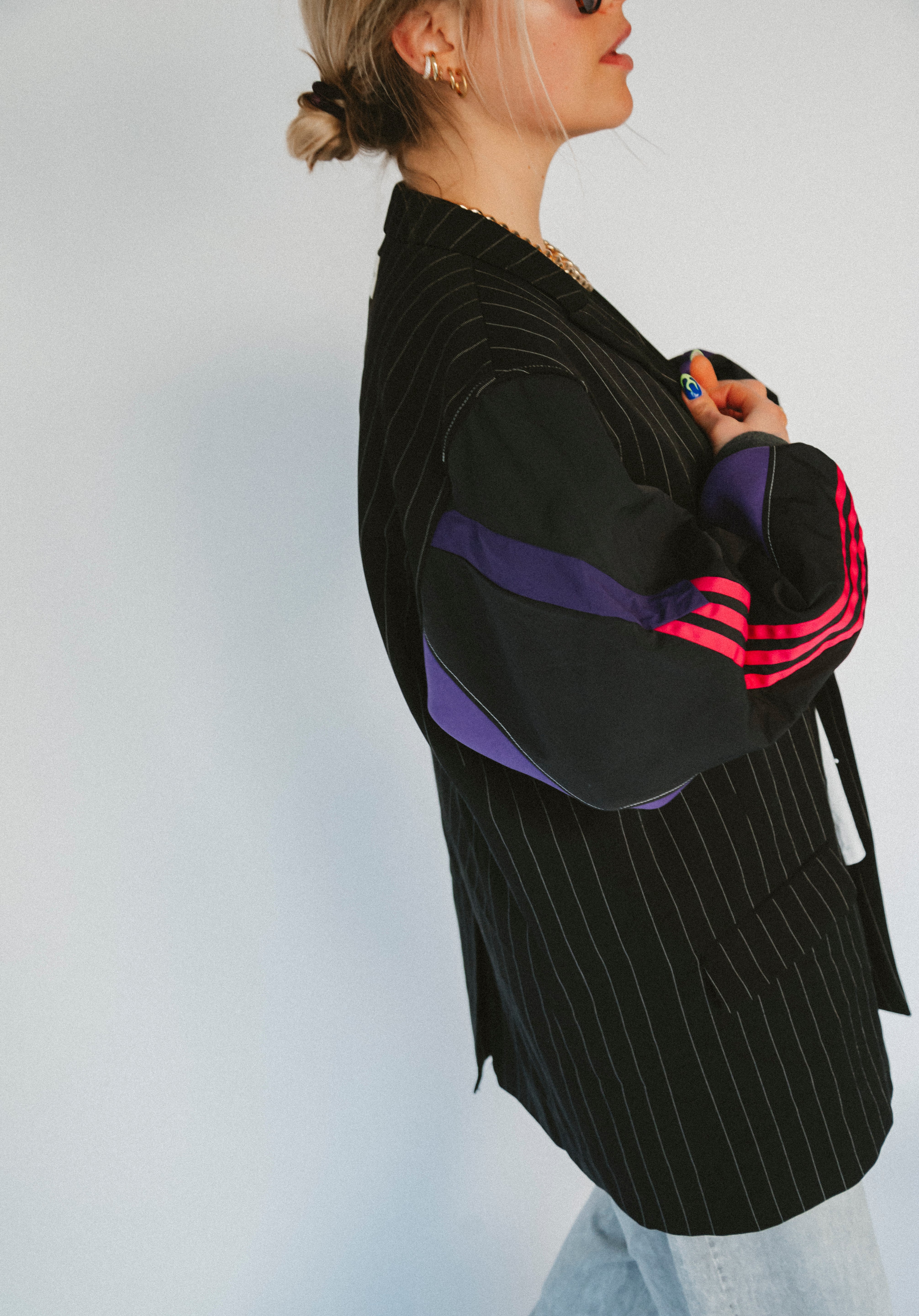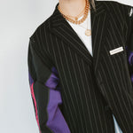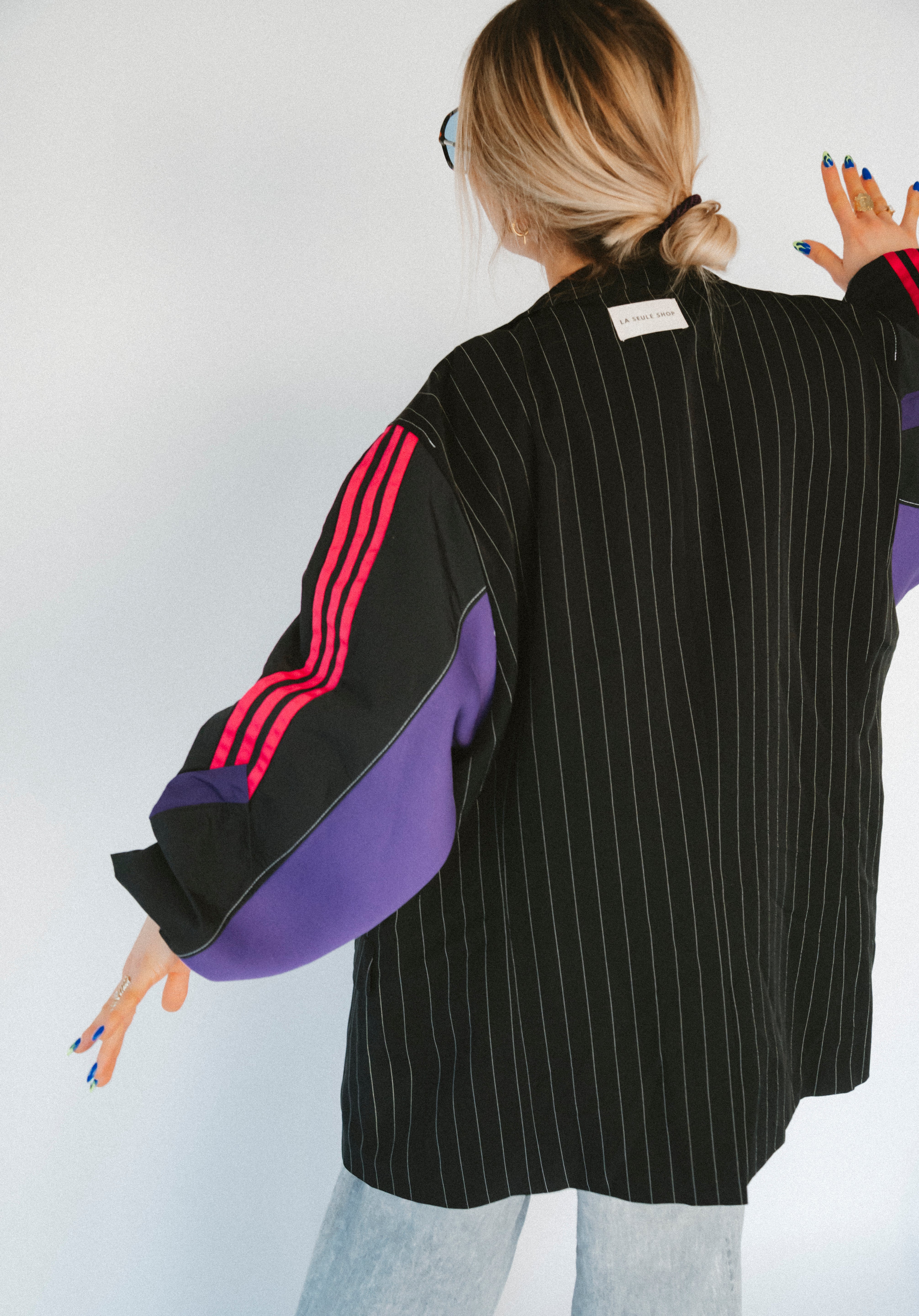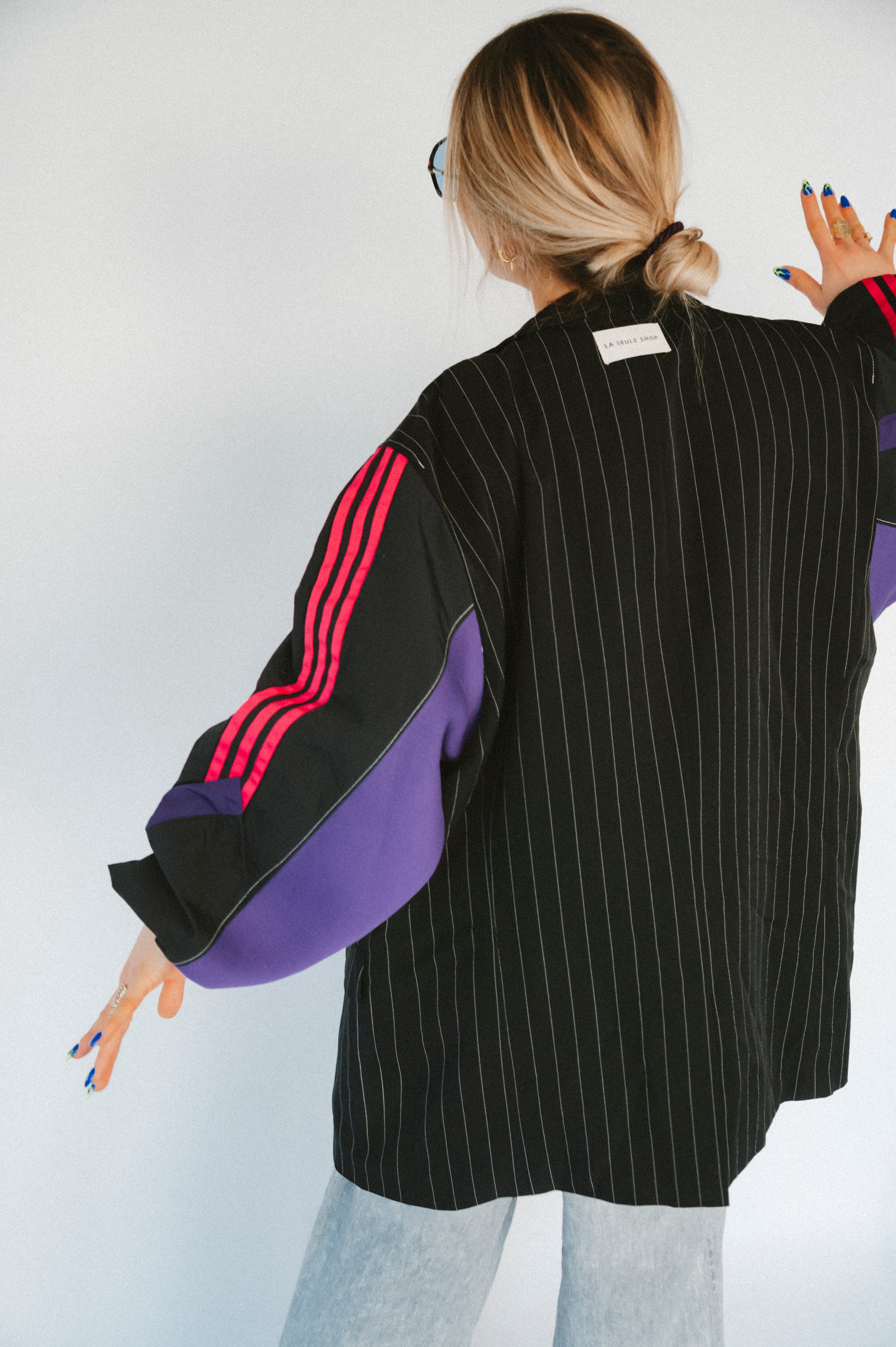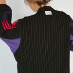 Détails : Blazer noir fine rayures , manches sweatshirt violet et sportwear rose fushia et violet