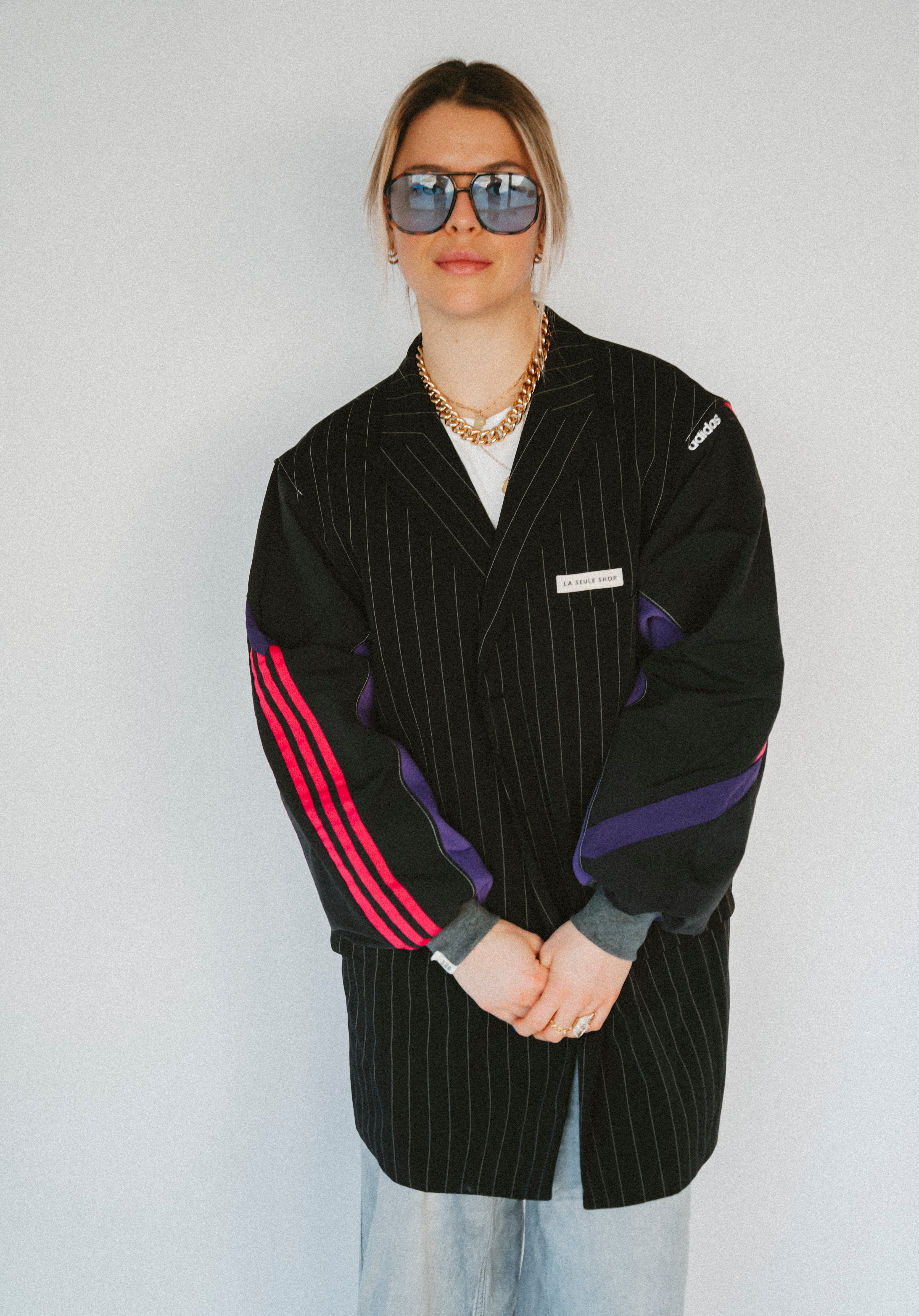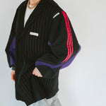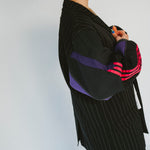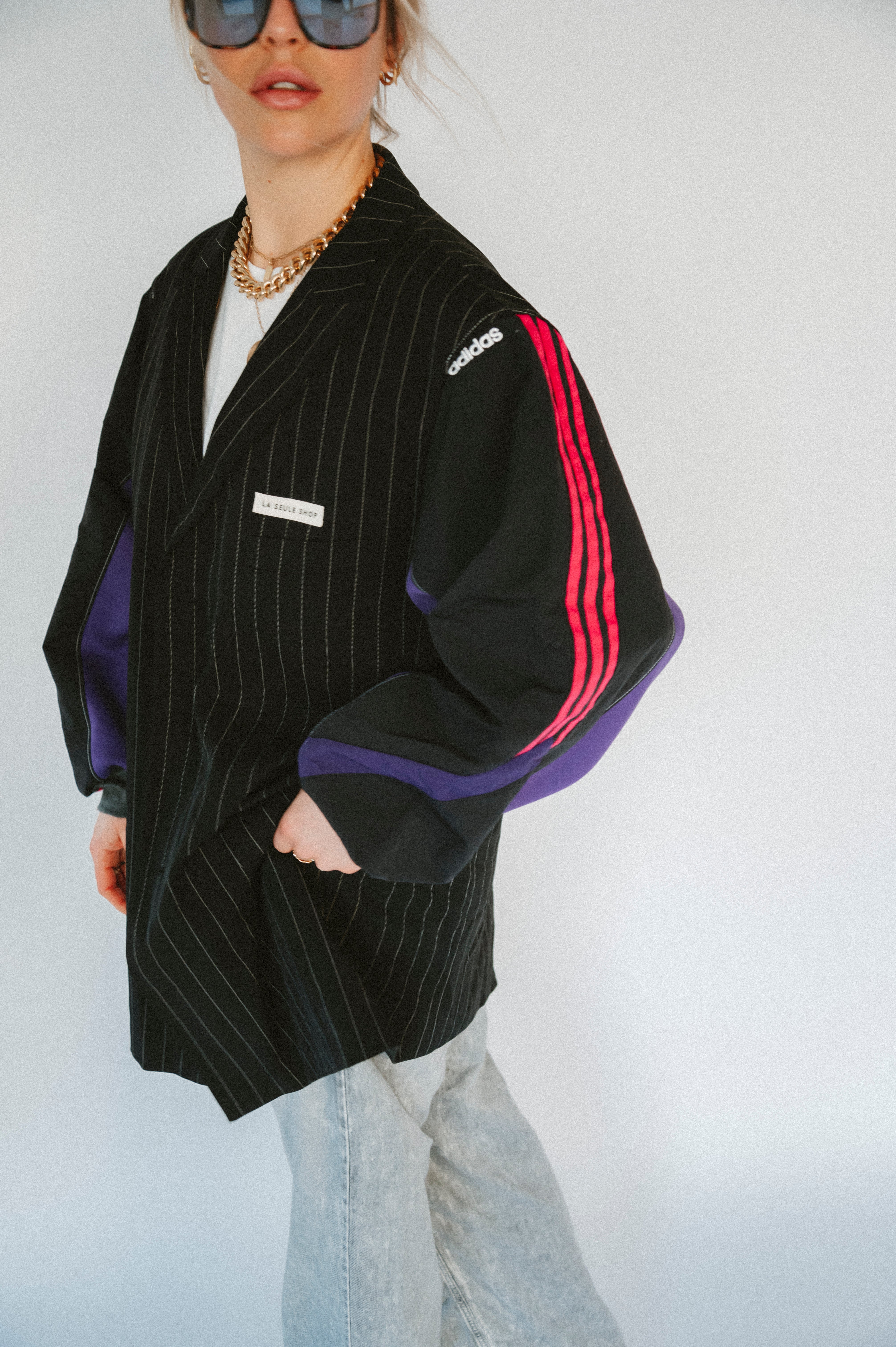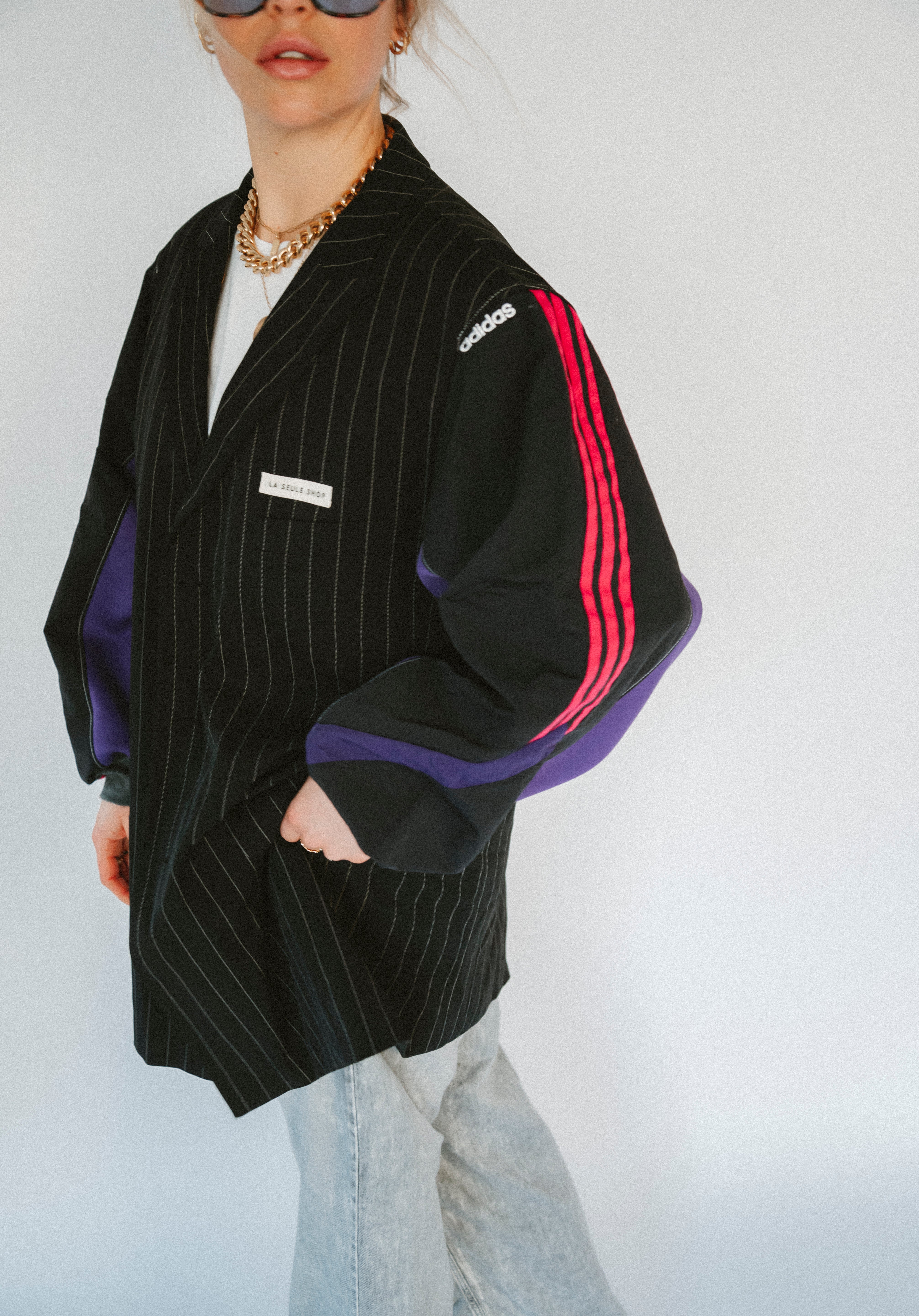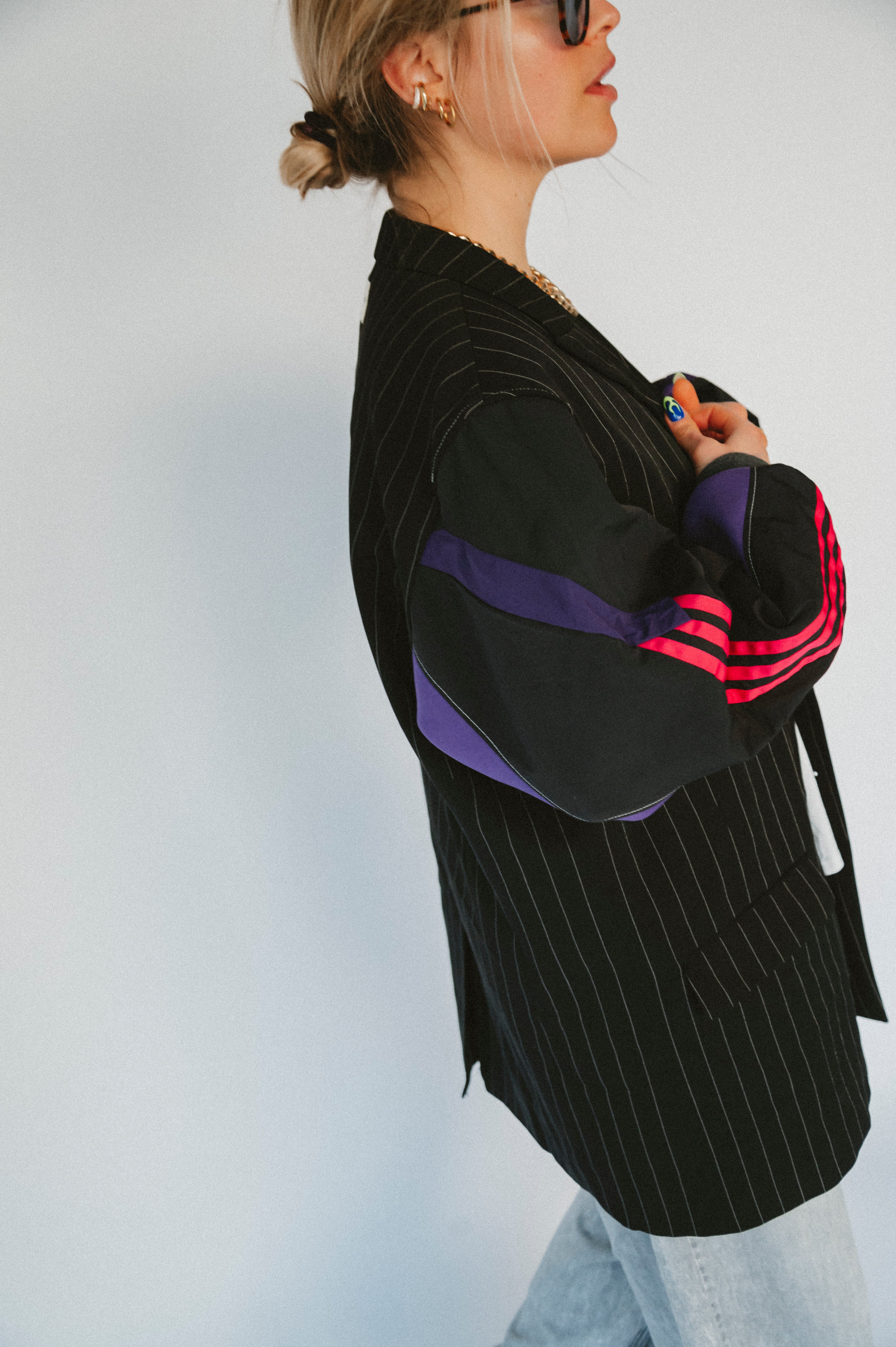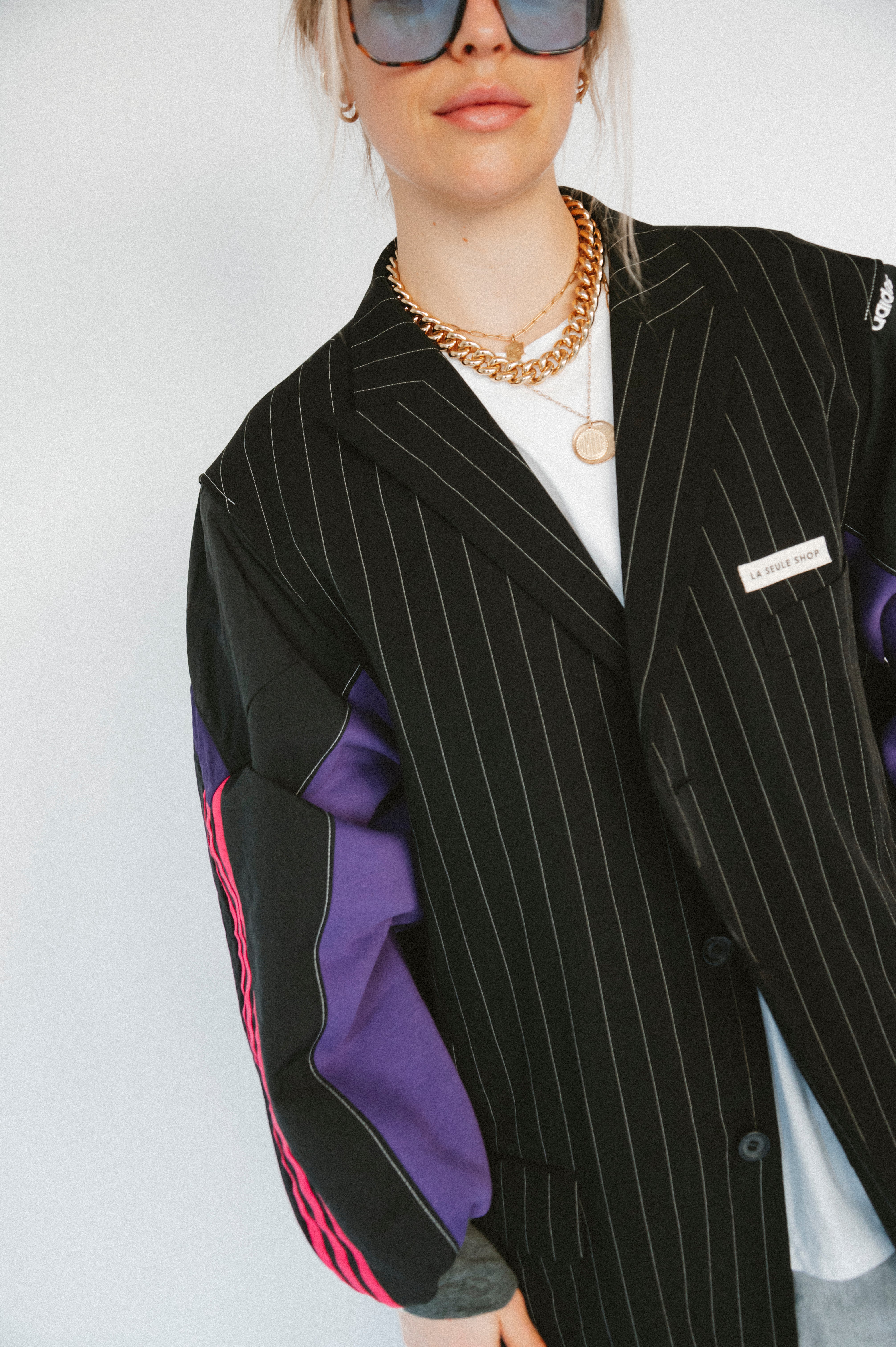 Détails : Blazer noir fine rayures , manches sweatshirt violet et sportwear rose fushia et violet