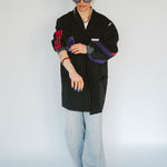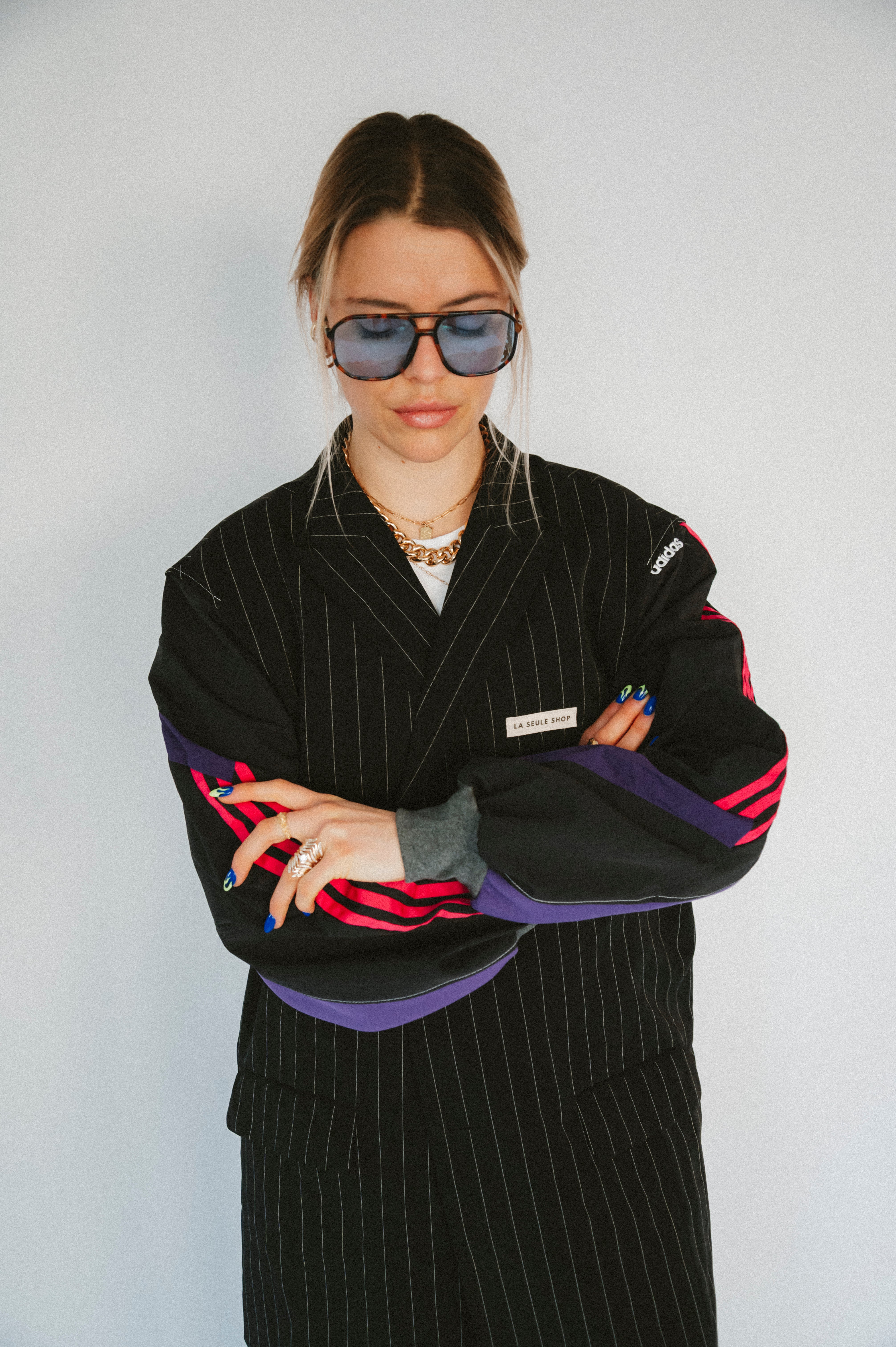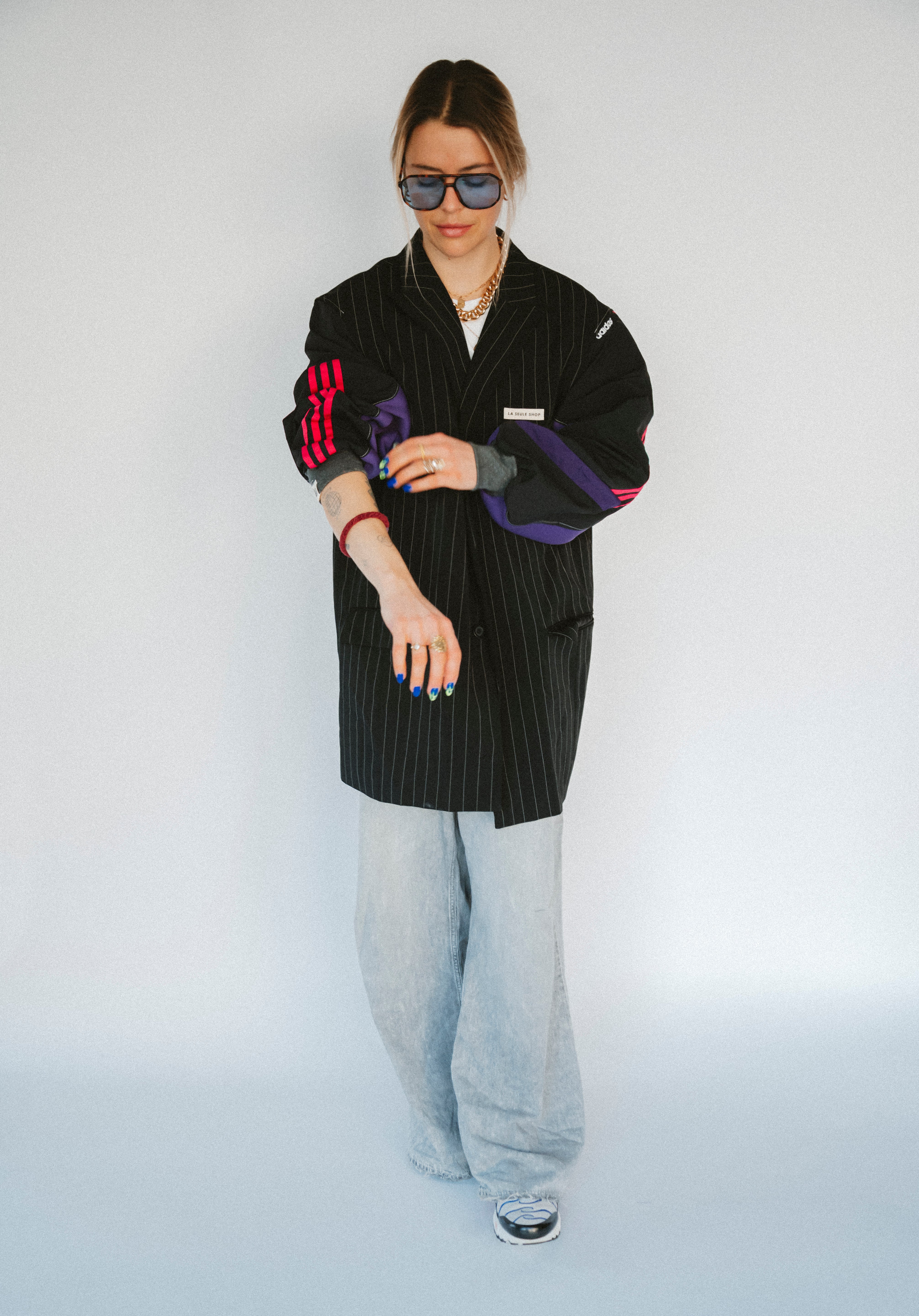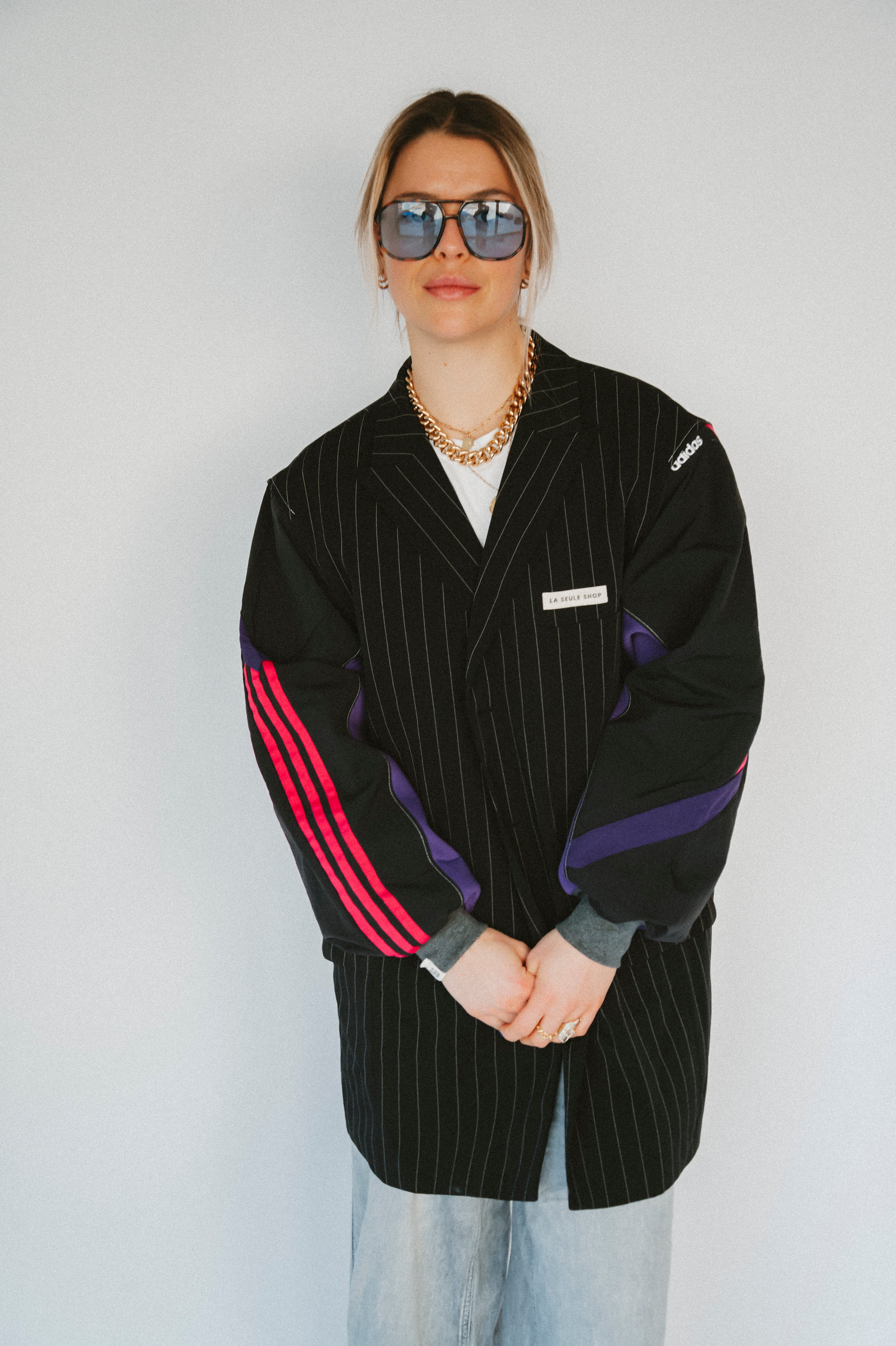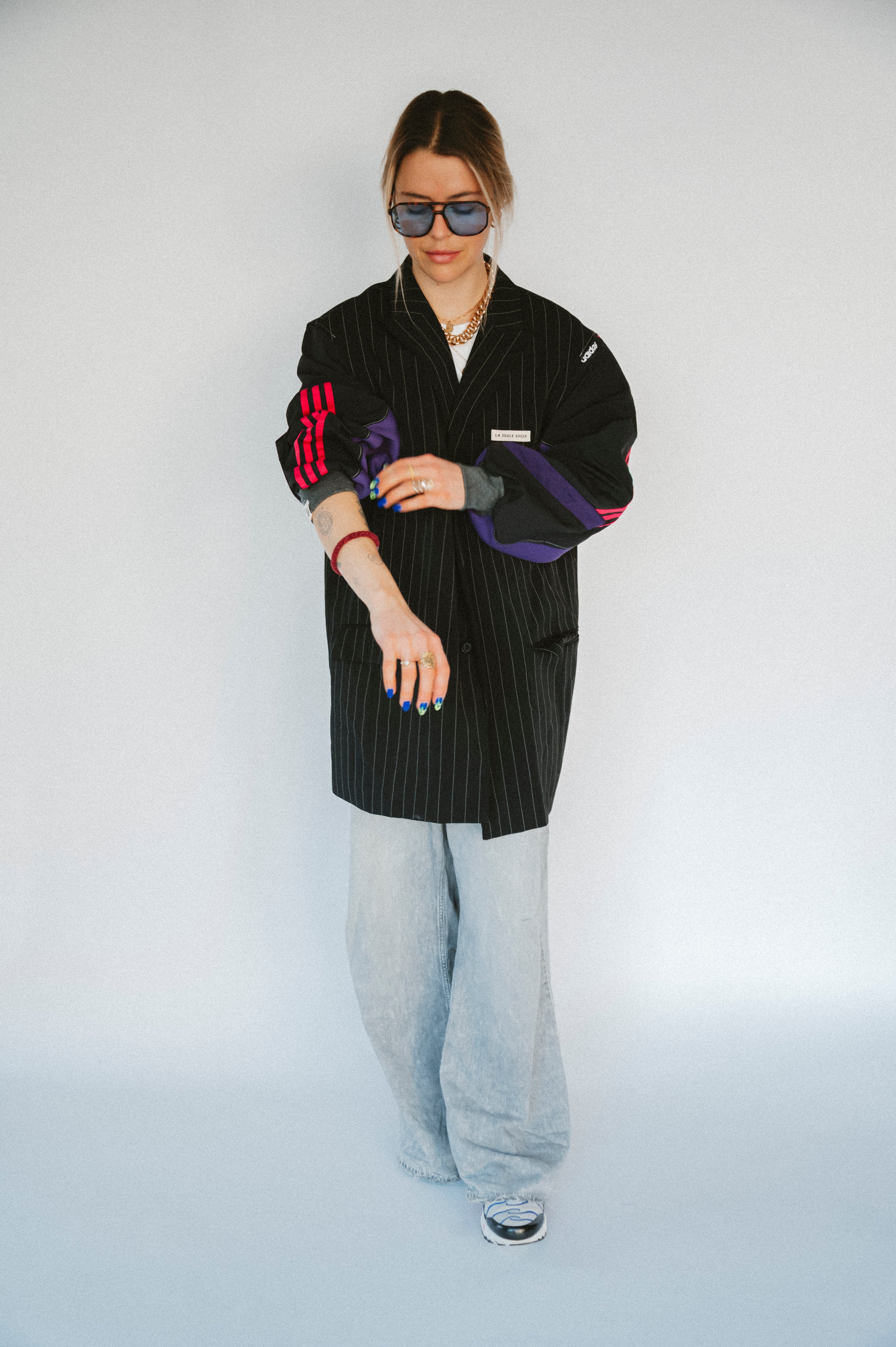 Détails : Blazer noir fine rayures , manches sweatshirt violet et sportwear rose fushia et violet